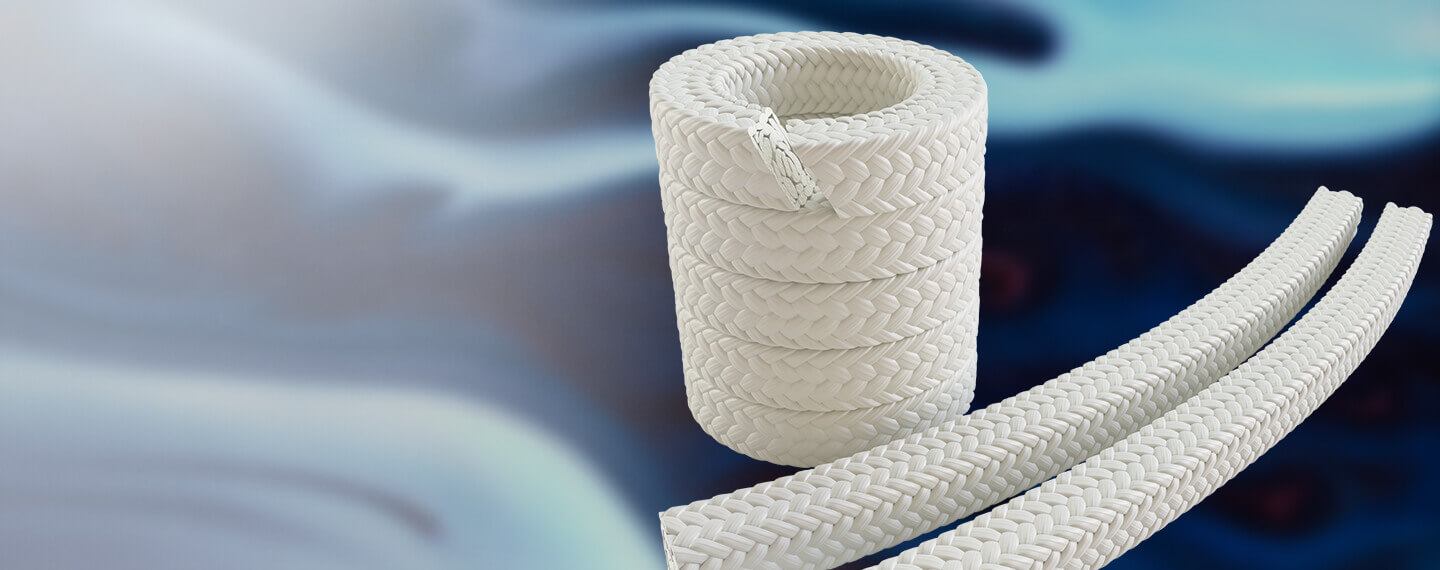 High‑purity white packing, cross plaited from tough, thermally stable PTFE fibre yarn for use in valve and potable water applications.